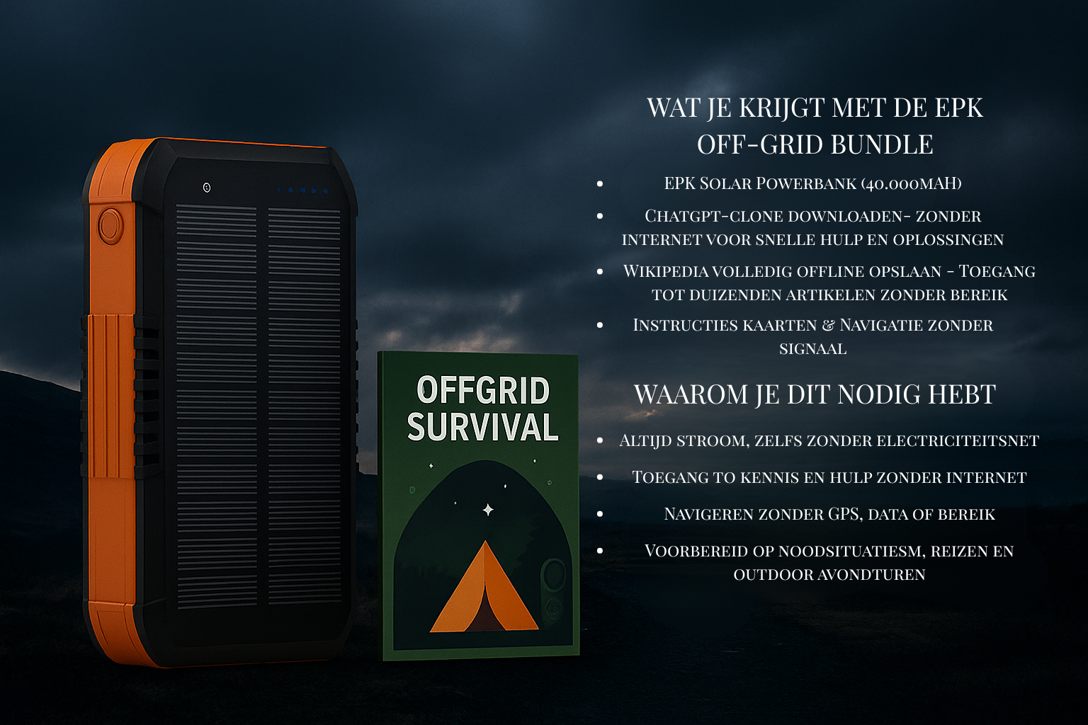 Met onze solar powerbank en het Offgrid E-book blijf je voorzien van stroom, goed geïnformeerd en klaar voor elke situatie.